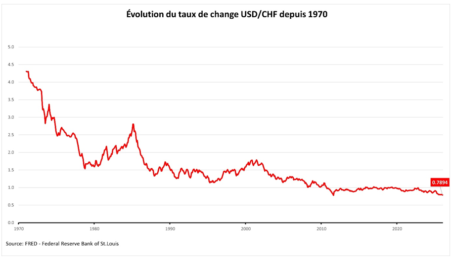 Dans un monde marqué par des chocs successifs, des tensions systémiques et parfois même des dynamiques de dislocation, disposer d’une exposition au CHF dans des portefeuilles libellés en euros ou en dollars apparaît non seulement pertinent, mais probablement encore plus indispensable aujourd’hui qu’hier – et la dépréciation du dollar face au franc suisse depuis cinquante ans en constitue une illustration particulièrement parlante (voir graphique ci-dessous). Le franc suisse joue ainsi un rôle d’ancrage, voire d’amortisseur, lors des phases de stress de marché.